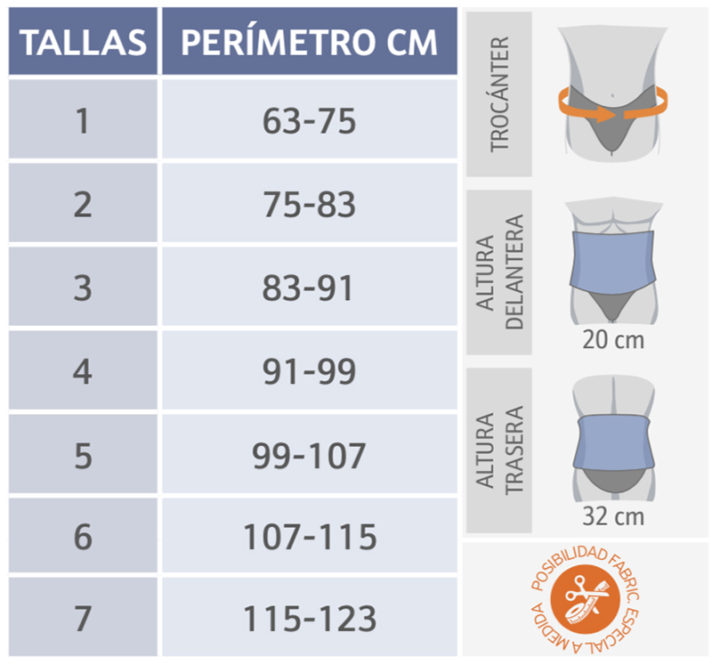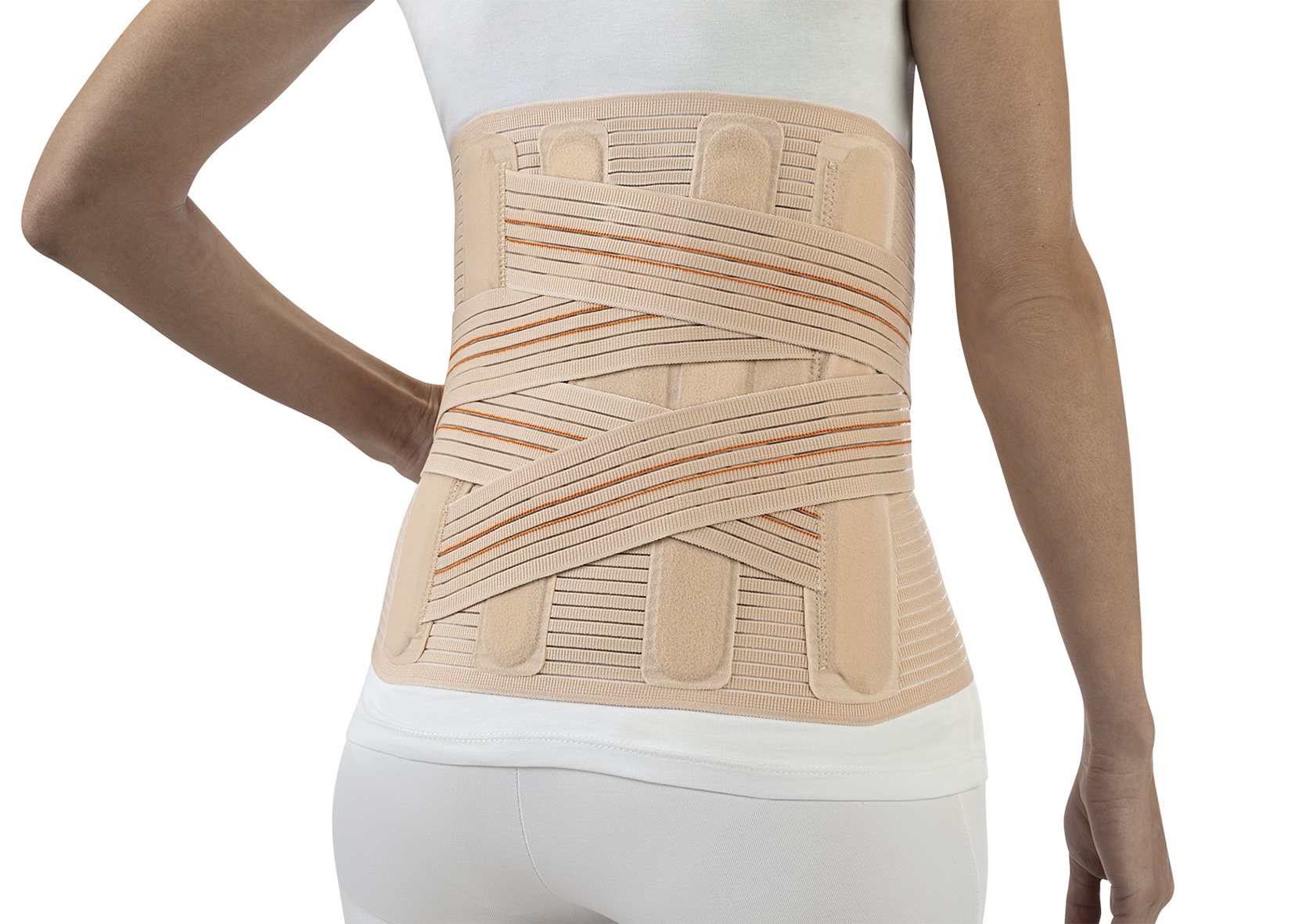 Υψηλή οσφυϊκή στήριξη της πλάτης από διαπνέον υλικό πολλαπλών ζωνών, με δύο ελαστικές ζώνες τεντώματος που διασταυρώνονται στο πίσω μέρος και στερεώνονται στο μπροστινό μέρος, κάθετα στηρίγματα πλάτης και μπροστινό κούμπωμα Velcro. Ενσωματώνει αφαιρούμενη οσφυϊκή πλάκα από αφρώδες υλικό για την παροχή θερμότητας στην οσφυϊκή περιοχή.
